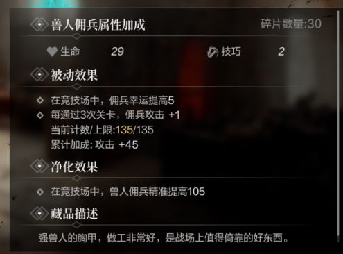 所以其实相比较藏品的抽取来说,养成其实更为重要,藏品的被动效果是全佣兵加成(抽到兽人藏品也别急着退坑)