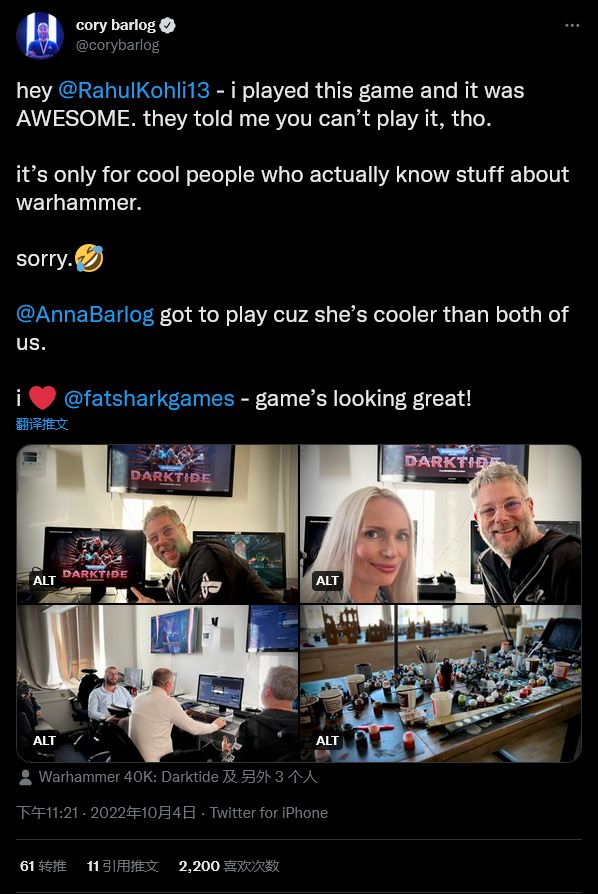 Cory Barlog 近日参观了《战锤末世:鼠疫》系列开发商 Fatshark 工作室,并且试玩了最新作品《战锤40K:暗潮》,并在推特上分享了这一经历。