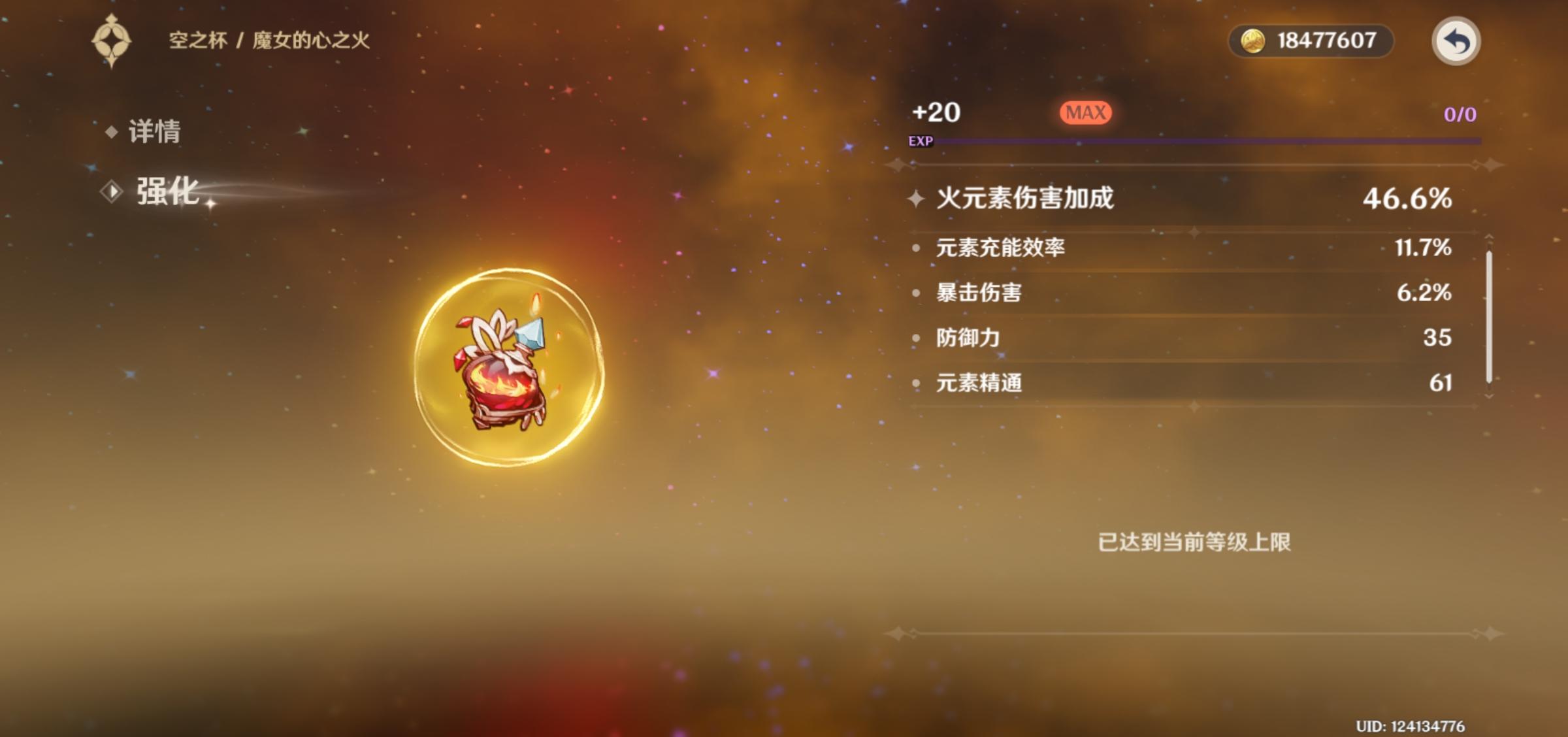 胡桃复刻到现在一直在养,深渊次次打满的圣遗物都拿来合成魔女了,然后最好的火杯就是这样