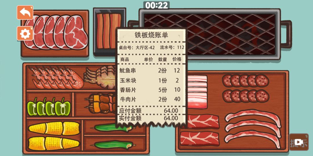 烧烤时,将食物按图摆放好,然后用钢丝球将烧烤架擦干净,最后按照订单,将对应的食物放在烧烤架上即可。