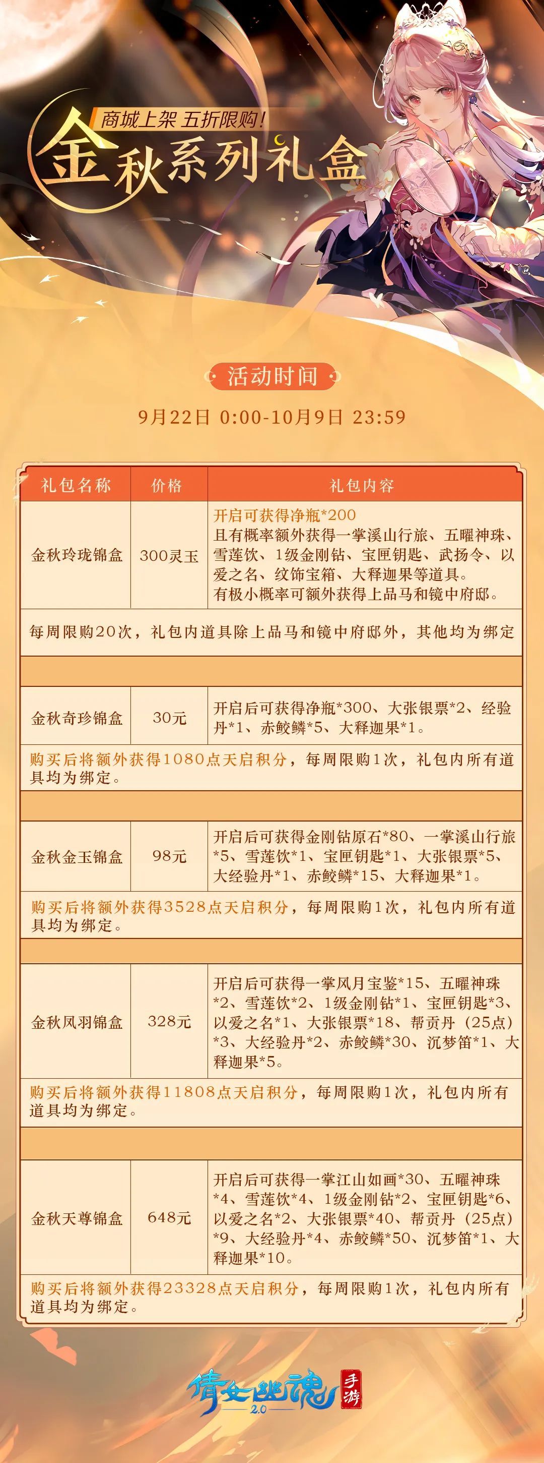 1. 金露天赐,好运相伴,金秋锦盒于9月22日-10月9日开启售卖。灵玉商城礼包区将上架多档折扣礼包,使用可获得金刚钻、宝匣钥匙、五曜神珠、武扬令等珍稀道具。限时折扣,千万不要错过!