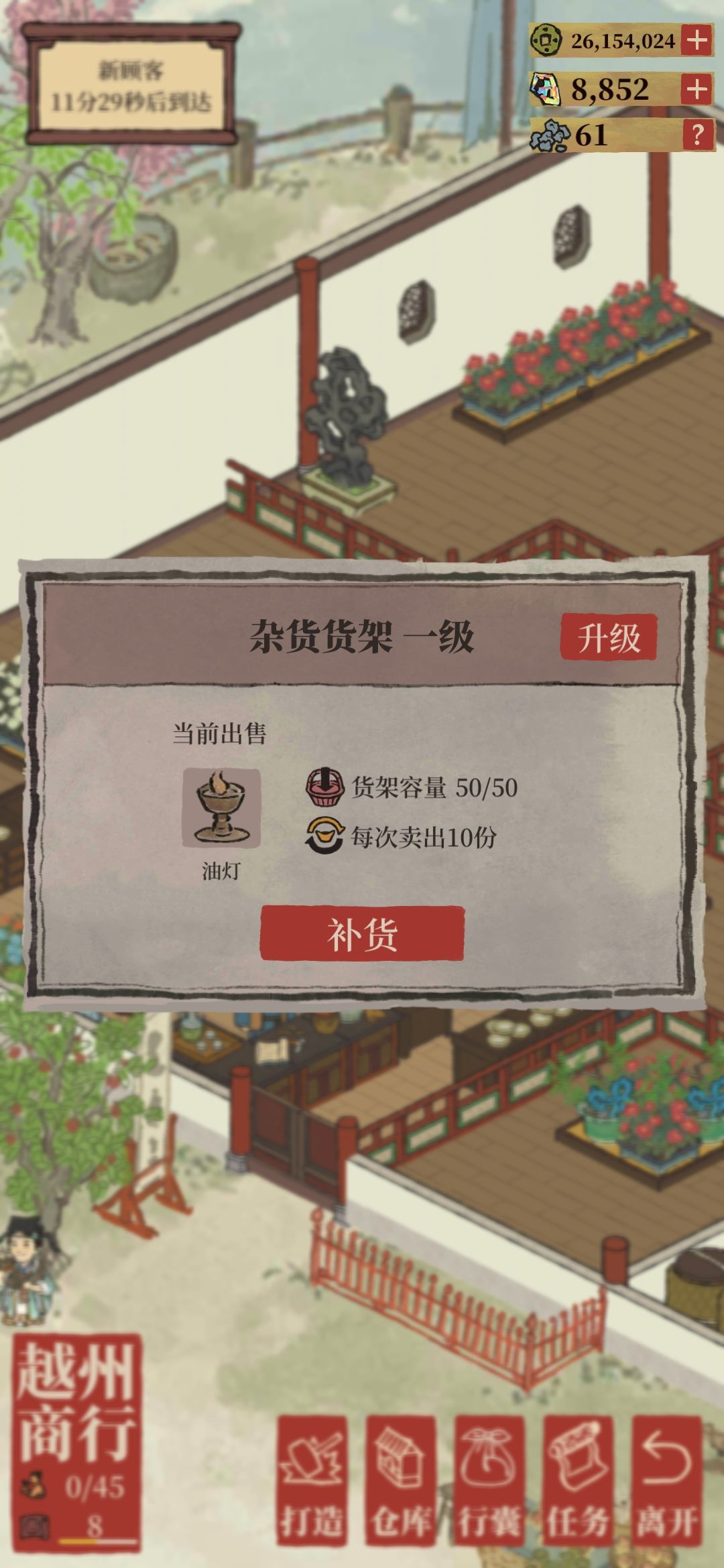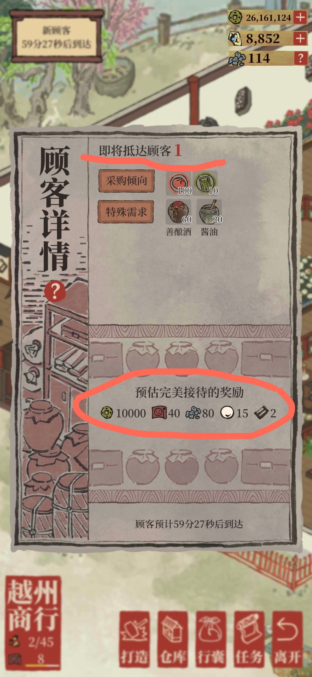【这里说明一下,评论区有朋友说前期可以空接待散客,只接富商,这是对的,商行口碑等级越高顾客也越多要求也越高,为了满足富商的需求快速扩建商行可以直接富商】