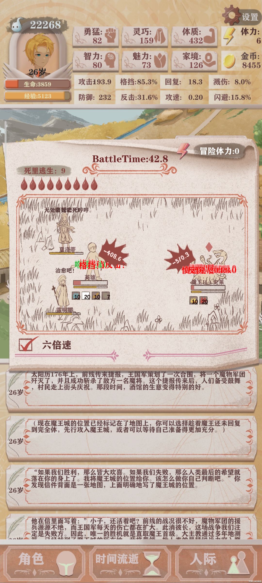 再发一下盾勇,邪血和健身的组合过残十,这次我没有sl过全部都是一次过得,魔王一出来就马上去打,15条命,打死还剩9条,强度非常可以基本等于可以闭着眼国残十的,装备也不算特别好,总体思路就是前期不要读书,去跟小孩玩还有去院子里跑步,十岁时要买马节省体力,然后是睡袋和鱼竿,因为这个组合前期特别强,所以哥布林都是小菜一碟,随便打打刷刷装备就能过了,巨人药剂一定要买满,老奶奶的话看有没有闲钱,装备的话戒指一定要生命戒指,前期属性主要堆生命和防御到中后期防御起来了可以堆格挡或者闪避,下面放装备和属性图。