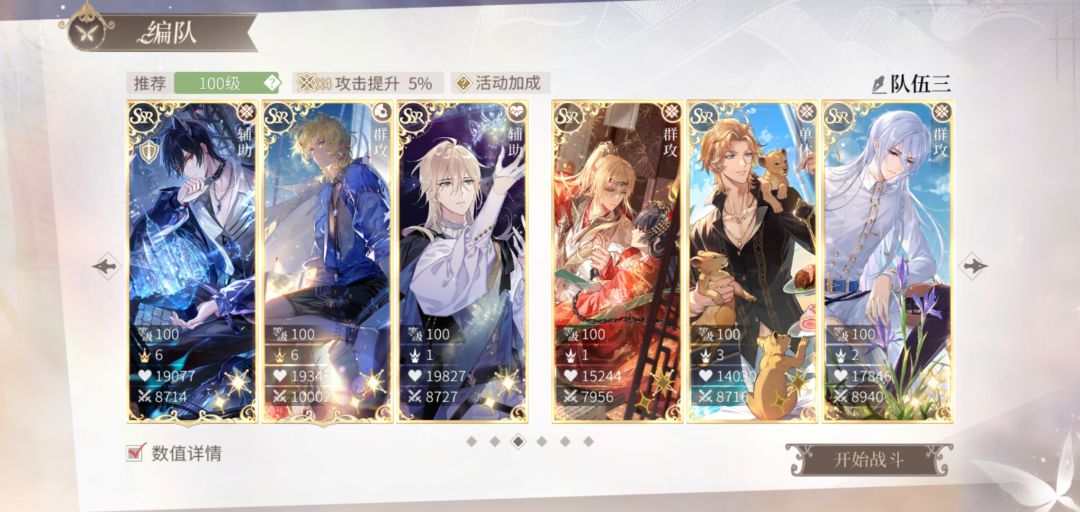 开局1回合小技能(完形生命+20特技条,星辰破碎推条,沙椰加伤+推条)都用上,保证沙椰能开大,2回合不出意外完形生命开大招消霍列斯无敌,全力输出就完事了。