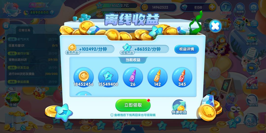 金币流:缸里主要养的鱼为sss鱼,但是并不强化,只为了多产出一些金币。