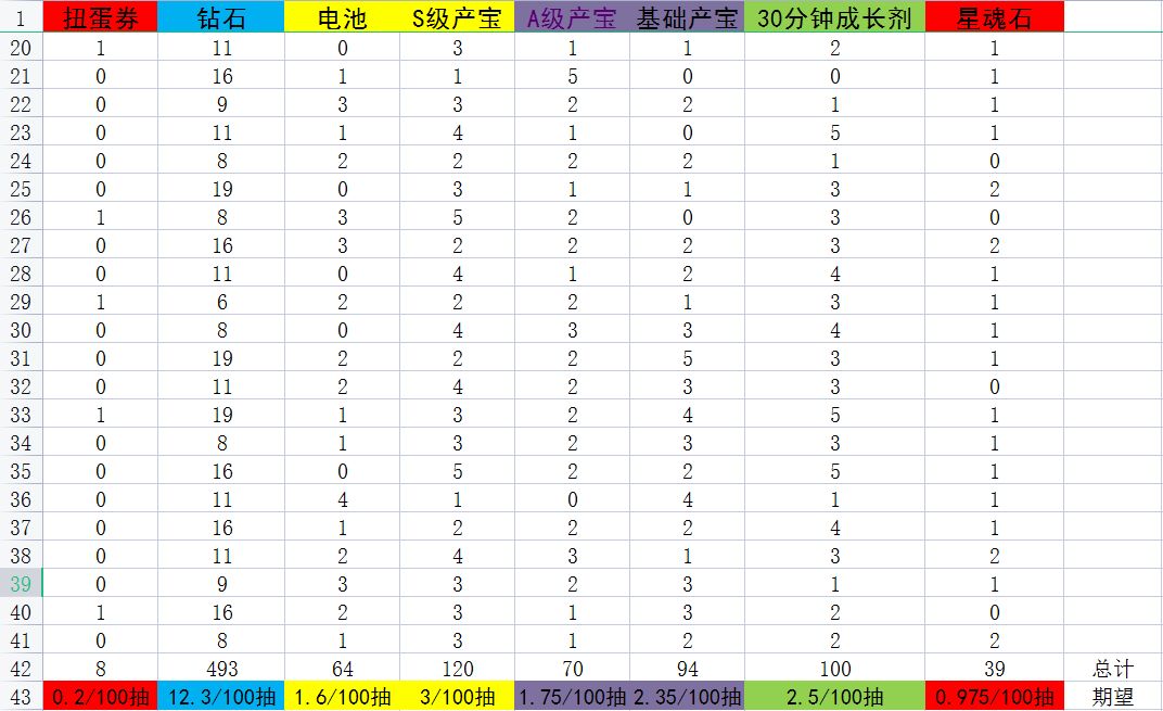 两天屯了2亿多金币,把40次抽奖的数据都记录下来了,期望表示每100连抽(也就是500万金币)将会获得的道具数量,表中只记录了我觉得还算有用的东西,其中还有各种鱼食还有一些杂物就懒得统计了,样本数量可能不是那么多,数据不是太准确,不过作为参考应该是差不多了。