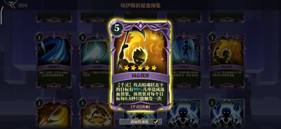之前介绍了千灵出血的卡牌(拉满99%概率出血),有的局出血有点小作用。这时打法可以稍做变化,一个泣斩跟一个千灵,千灵不为打伤害,只为叠流血,流血最高叠5层。
