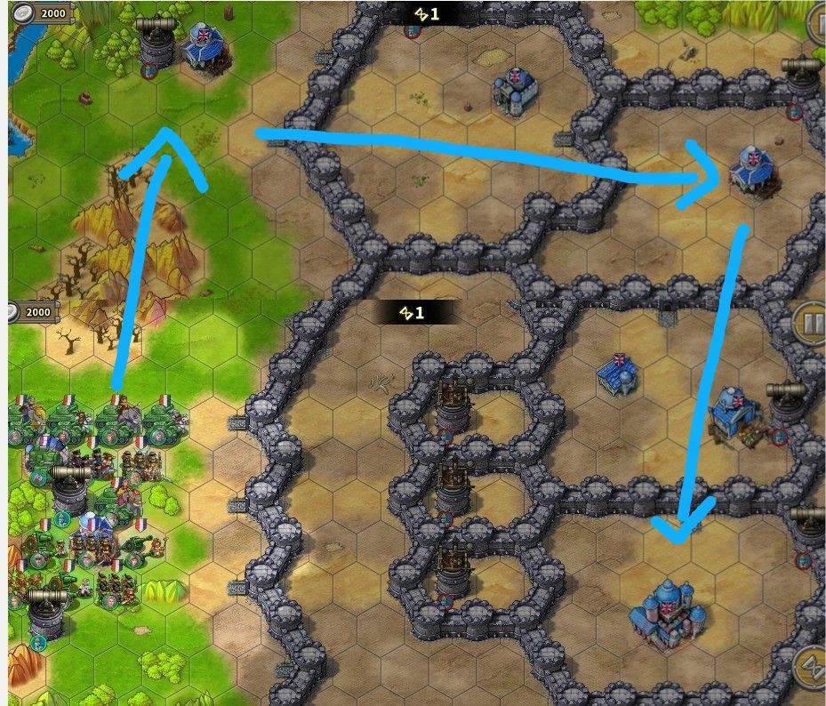 宙斯+奥丁,此时怒气应该是不够用的,很缺怒的指挥回头到第一房间打无名将,怒气快好的指挥怼墙(炮塔血很少,可以作为怒气包),同时派1~2炮兵下来打城堡。之后有大开大收掉