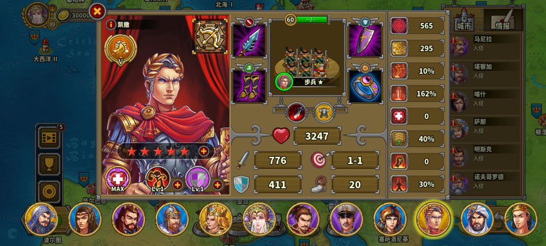 第一回合放步兵公主、15回血公主,将领全面压上,凯撒站住骑兵营,步兵营持续出步兵。