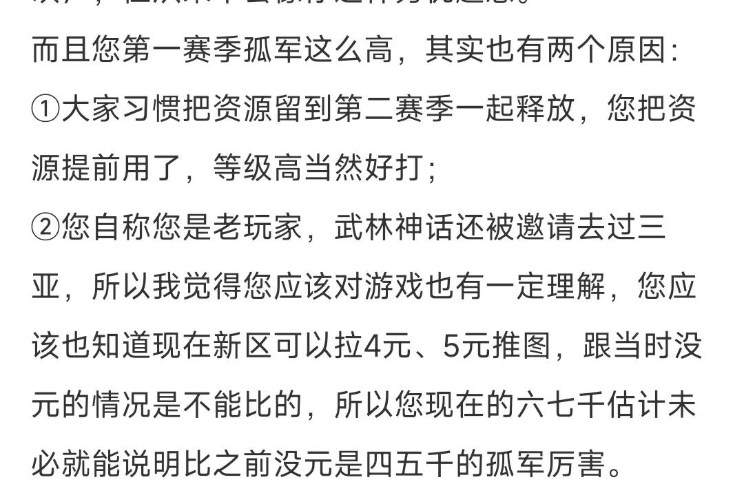 你就非常主观的认为7000的孤军一定是提前用了资源换来的,这就是我说的老区玩家的片面的地方,根本不那么了解新区的真实情况。现在相同的氪度,能获得的资源比以前多很多。