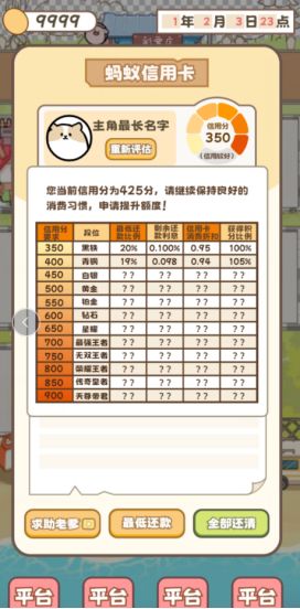 1. 信用卡系统:游戏中几乎百分百还原了现实中的花呗,让你亲身体验一下,还不上花呗的痛苦。如果你过于大手大脚,赚的可能还没有利息多的情况也是可能出现的。当然还不上也可以选择,最低还款,但是要支付高额利息。当然你有的好,将大大加速游戏的进程,毕竟还是用明天的钱办今天的事儿。(游戏中为批判的角度做的信用卡,希望大家不到万不得已,在现实中不要轻易使用借贷,成年人的崩溃玩玩从欠钱开始。)