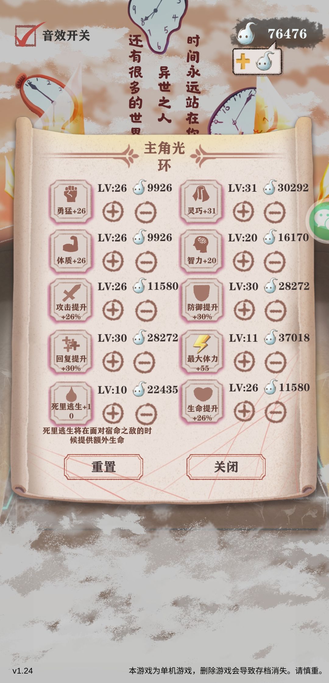 第一要务:智力+魅力,由于缺少贝爷,且下本极度痛苦,因此前期小孩玩完就死读书,把智力拉高,前期通过一回合摸几个普通怪硬攒个4-5级,补出前期关键性的回6、当头以及隔山。副本进度都是浮云,命够多,前两个boss怎么都能耗死。不要过度着急装备和过地图boss。常规魅力到35左右就可以不再参与祭典了,体力省下来。智力想办法拉到50起,然后开始体质和灵巧提升。下本注意,前两三次其实20体即可,反正打不了几个怪就不行了。