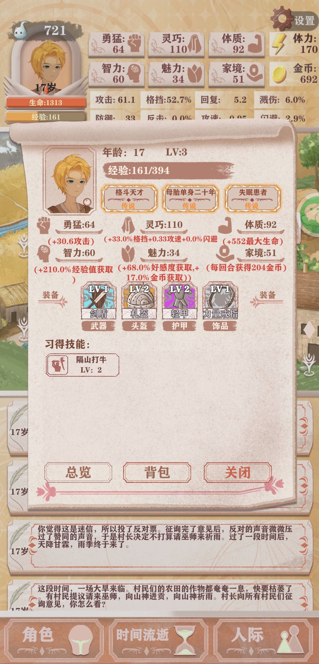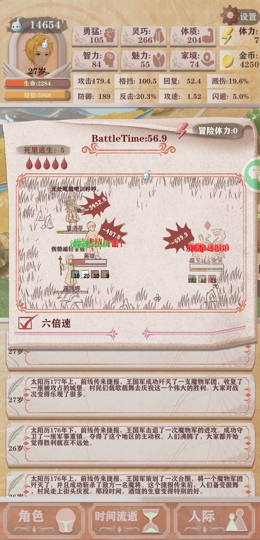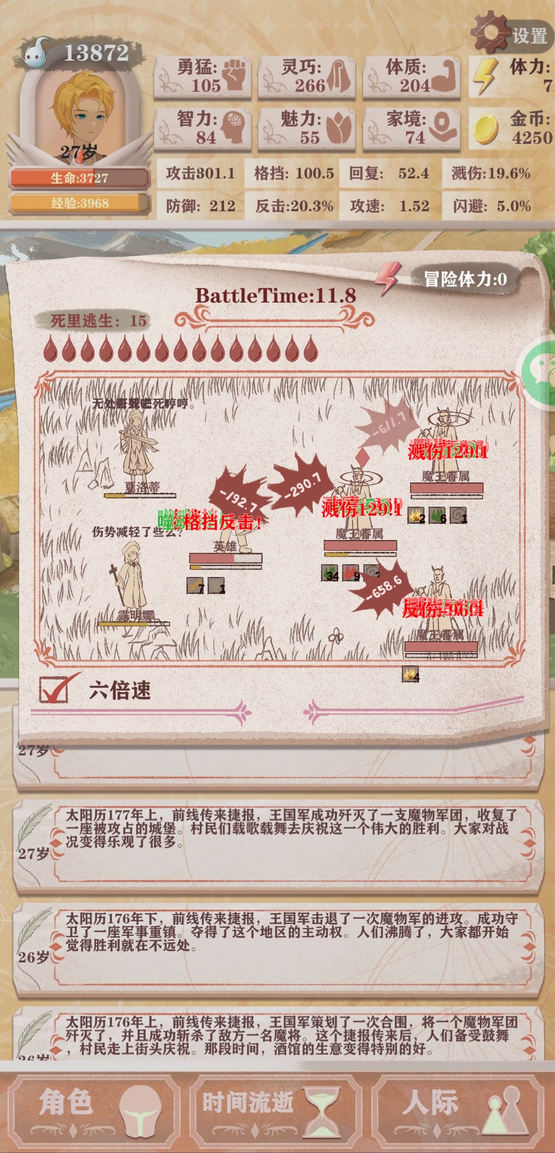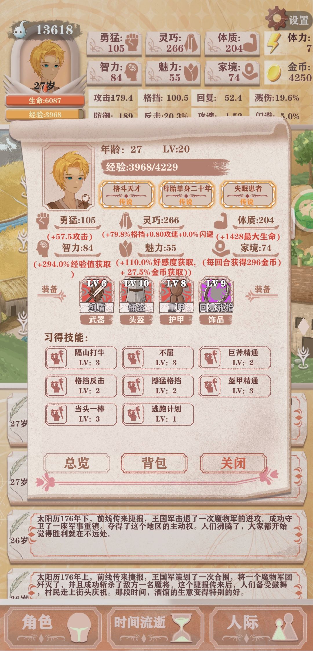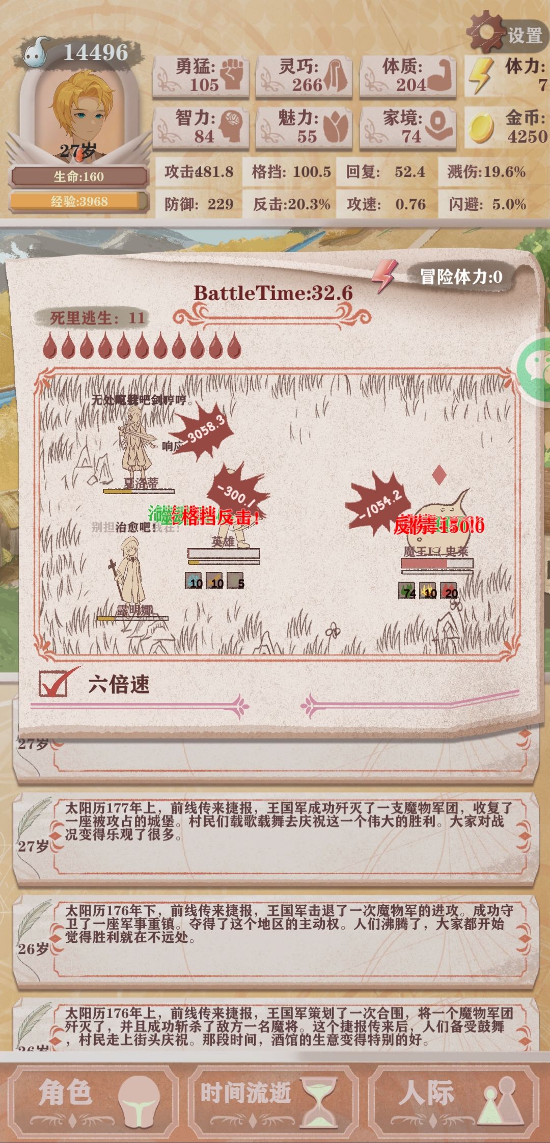 然后至少还有三回合可以行动,剩余回合至少2回合把兽人迷藏补齐,然后根据情况选择刷地洞补等级或者刷兽人摸装备。我这轮比较好运,连续三回合-10,实际上应该有5-6回合,但是更幸运的是,第一次兽人图掉了8重甲,第二次掉了10头盔,装备直接齐了。。。所以提前27岁就试了下打了魔王结果一次过了。