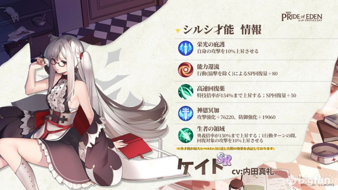 血脉猛爆:攻撃強化+85740、防御強化+9530猛毒浸透:奥义倍率94%→118%UP,并使攻击目标目标防御力下降20%,持续1行动回合,“毒素发生”,敌人身中毒素时,奥义追加自身攻击力20%→25%的伤害,奥义后敌人身上的“毒素”清空。点评:属性全方面提升,公会战群刀必上角色,无人能撼动。1.2.SR凯特
