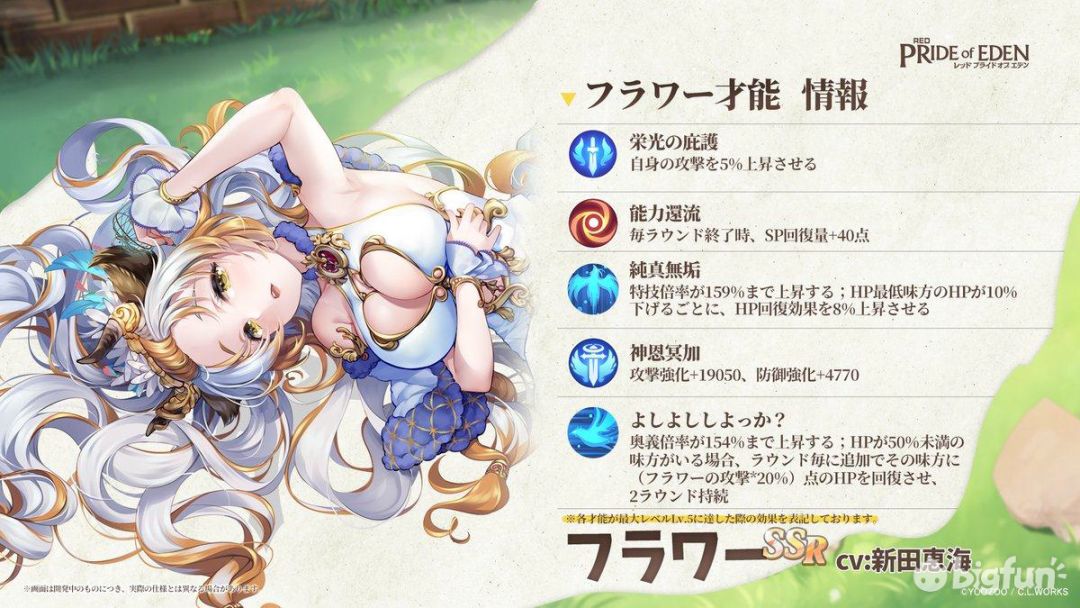 天使的圣裁:奥义倍率134%→154%,己方有HP未满50%单位时,每回合追加那名单位回复(弗劳尔攻击力*20%)HP,持续两个回合。