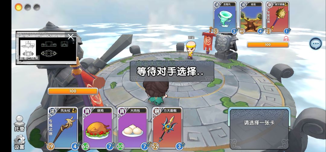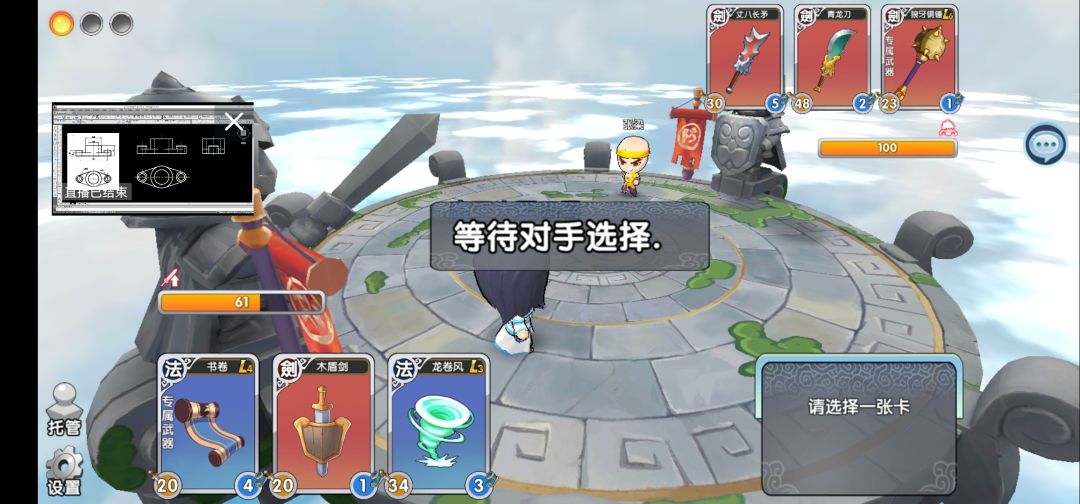 注意第二回合,用个酒还是不用酒?他两下专武是36伤害,61-36=25可以触发我残血线29。所以最后用龙卷风就行。当然用了酒也可以赢,100-34-34=32。我61-18=43。