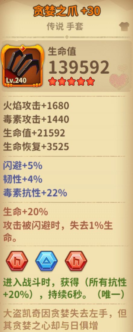 词条取舍 : 生命值类的词条可以不用强求,贪婪之爪附加了很多生命值,恢复类的词条多注意点即可。