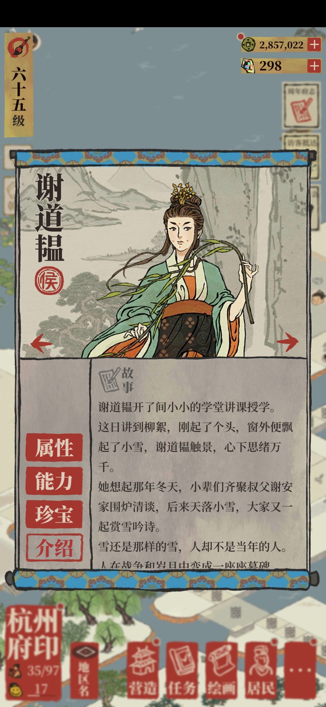 从小聪明伶俐,才思敏捷,有一日天下雪🌨️,谢安带领着侄子侄女们一起玩雪赏雪。谢安兴致大起,指着洋洋洒洒的雪问孩子们:“白雪纷纷何所似?”这时侄儿谢郎立即答道:“撒盐空中差可拟。”而道韫悠然神想后道:“未若柳絮因风起。”从此便有了“咏絮之才”的典故。红楼梦中曹雪芹也用“堪怜咏絮才”形容林黛玉。