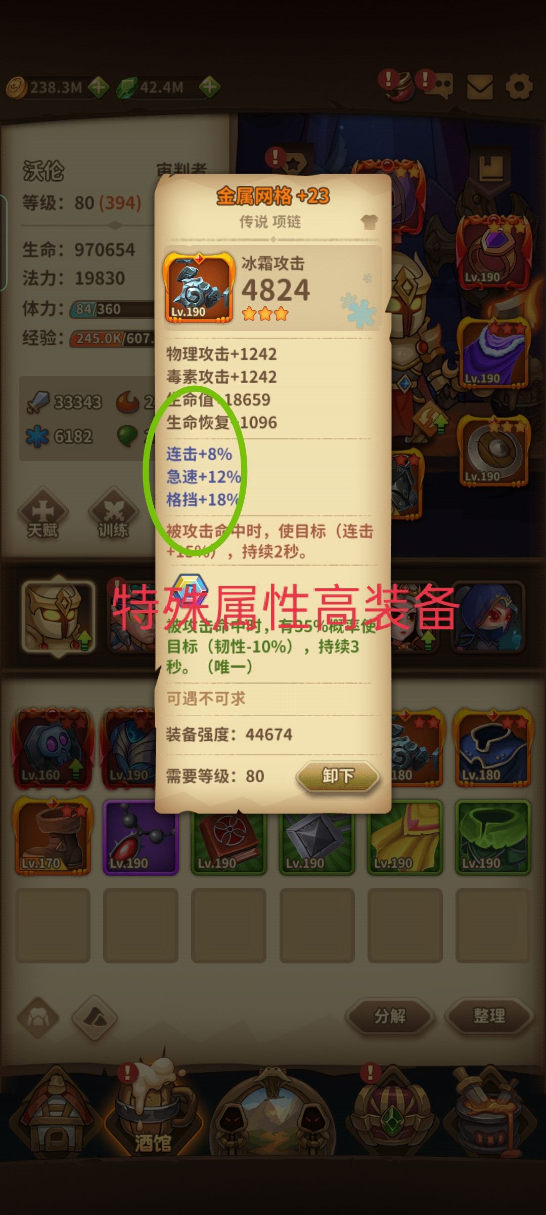 PS:这游戏除红装尽量不要带套装,套装基本是坑,前期勉强可以用,选择装备时尽量选带自己需要的特效装备,或需要的精准,连击,暴击,急速,闪避,韧性,格挡等特殊属性很高的装备