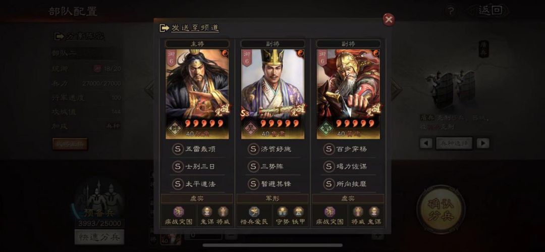 2.张苞携带三势阵,带上张角、太史慈,组成一个慢速队伍(三势张苞高几率抵御)。