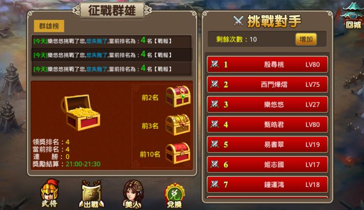 竞技场技巧总结:根据武将的PK属性和技能合理搭配,再加上美人系统辅助,以弱胜强不是梦。