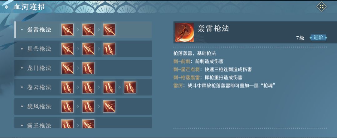 血河整体难度适中,普通攻击方式为刺和挑,可根据不同的普攻出招顺序产生不同的效果。