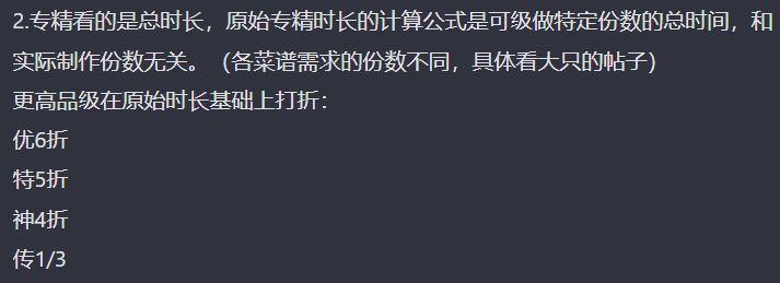 1. 例如需要两名光环厨能将一道菜从优做到特,则专精效率从1.67提升到了2.00。即是说,“优”级的专精效率是1.67(相比于“可”级),“特”级的专精效率是2.00。如果仍然做“优”级,却有两位逆时间刺客将开业时间增加65%,则做菜效率是2.75。这种情况下,从节省食材的角度讲,增加营业时间更划算。