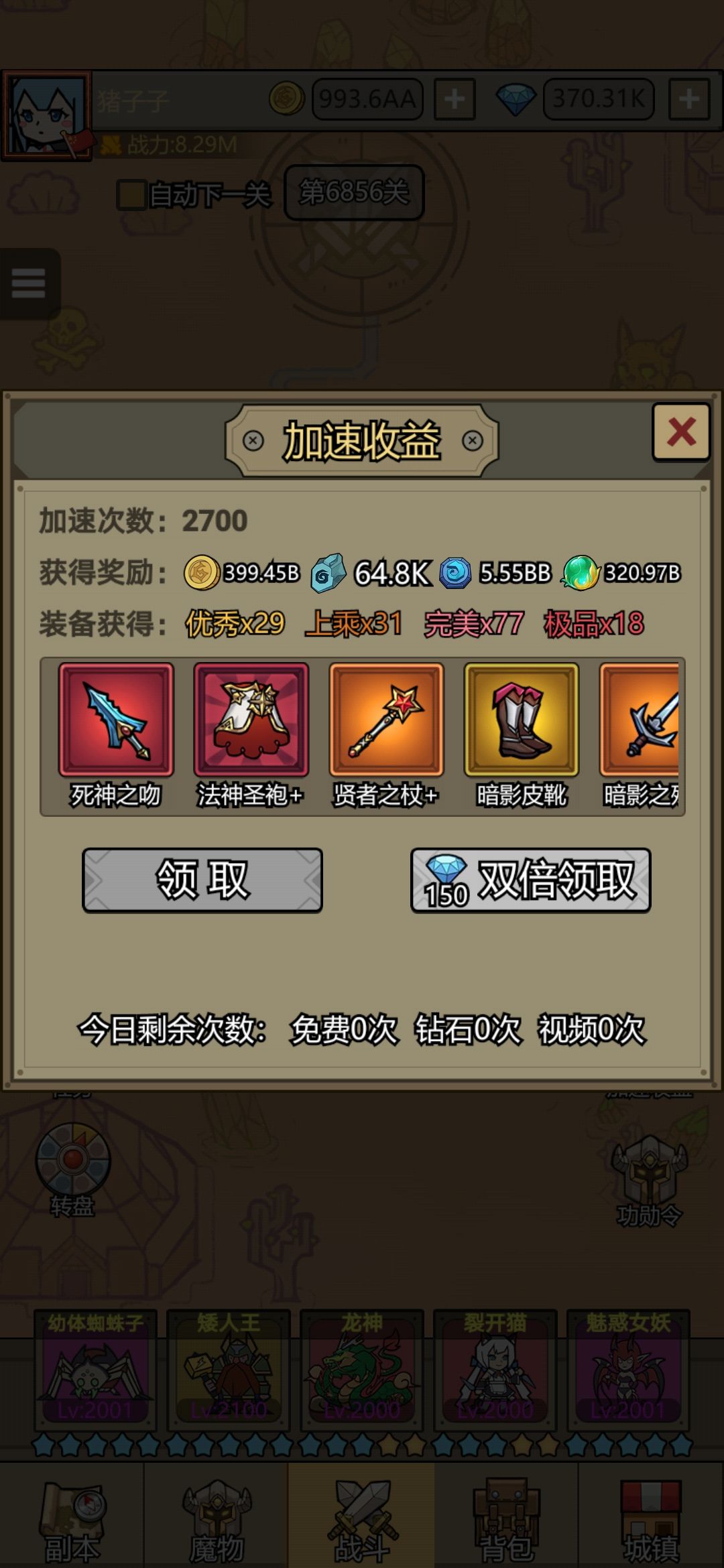 PS:今天龙刚到8星,刚刚替换了骷髅骑士,前期一直是骷髅骑士推关,骷髅骑士就可以通过7000关的~。