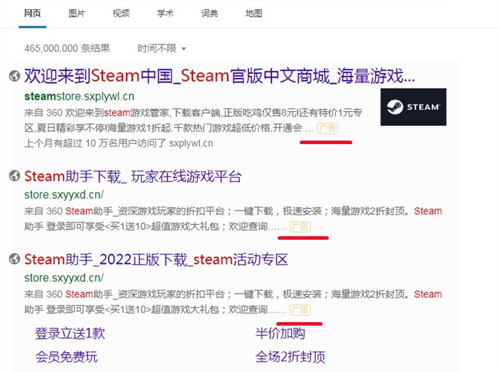 但这也不能怪兄弟们太容易上当受骗。很多新人可能只是从同学、QQ群友口中得知Steam的存在,然后一头就栽进了搜索网站竞价排名的陷阱。只要搜索Steam,排在首位的大部分时候都是山寨平台。百度大家都知道,国内其他几个不常用的引擎也没有好到哪去,连微软旗下的必应国内版也是如此。