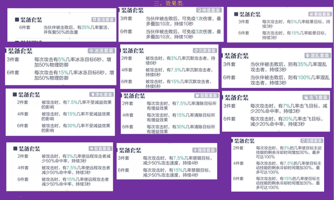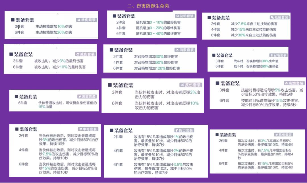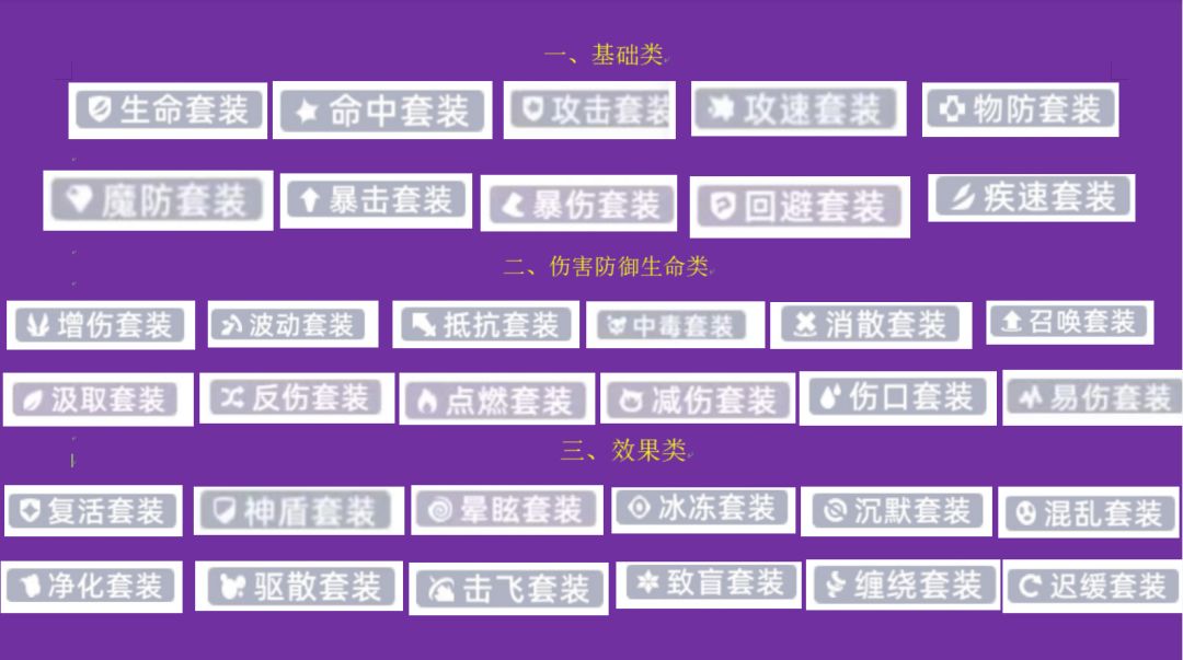 增伤套装、波动套装、抵抗套装、减伤套装、消散套装、召唤套装、汲取套装、反伤套装、点燃套装、中毒套装、伤口套装、易伤套装。