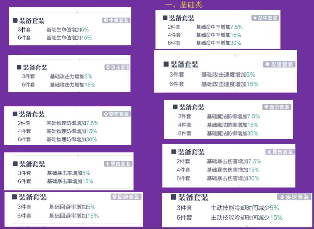 生命套装、命中套装、攻击套装、攻速套装、物防套装、魔防套装、暴击套装、暴伤套装、回避套装、疾速套装。