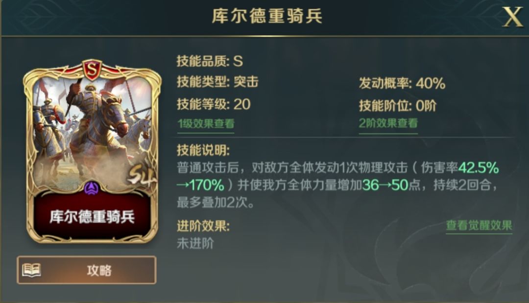 【库尔德重骑兵】属于突击技能,普攻后对敌方全体发动一次物理攻击,并且为全体英雄提供属性增益,当携带英雄拥有连击效果时,有机会多次发动该技能,可大幅提高我军整体的输出能力。