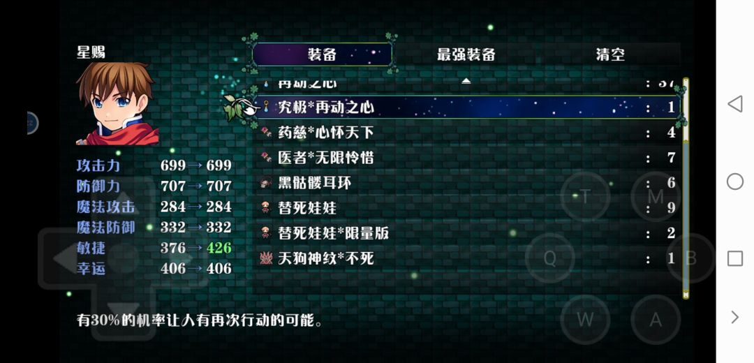 下面是一些装备的属性图,除了那个天堂地狱一线生机天(好像是免死一次,HP变为1,没啥卵用)忘记截图了,其它装备基本都有了。