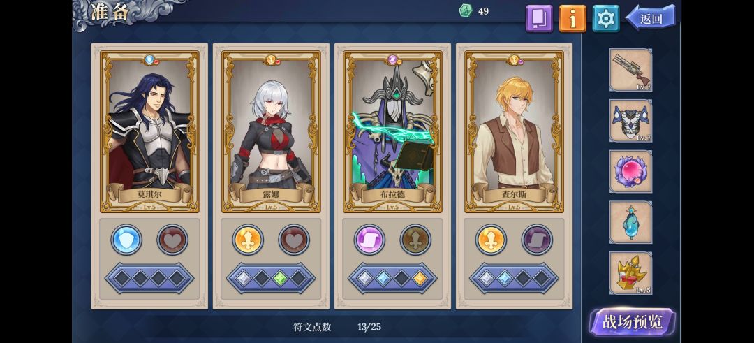 其他角色不重要带有攻击指令就行增加伤害,装备撘配是经典的护盾转伤,暗语宝珠必带可以开局100能量