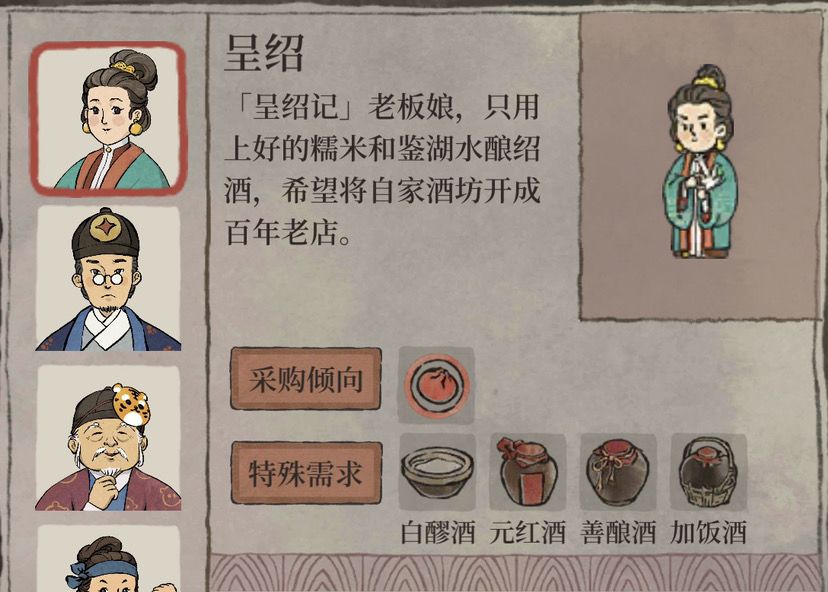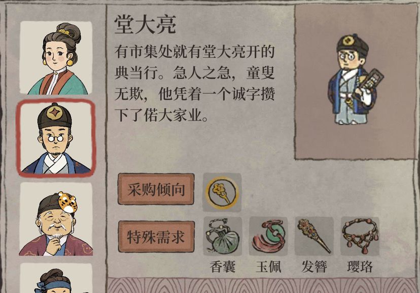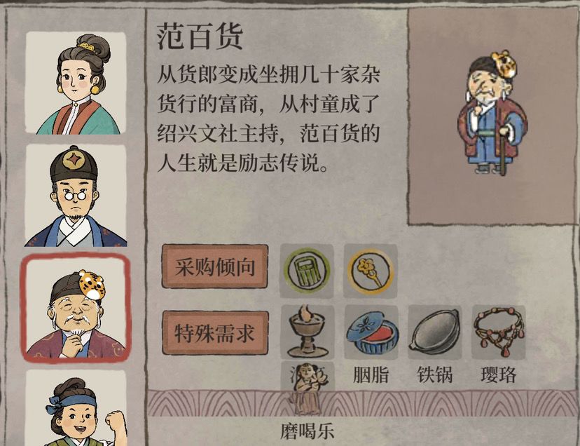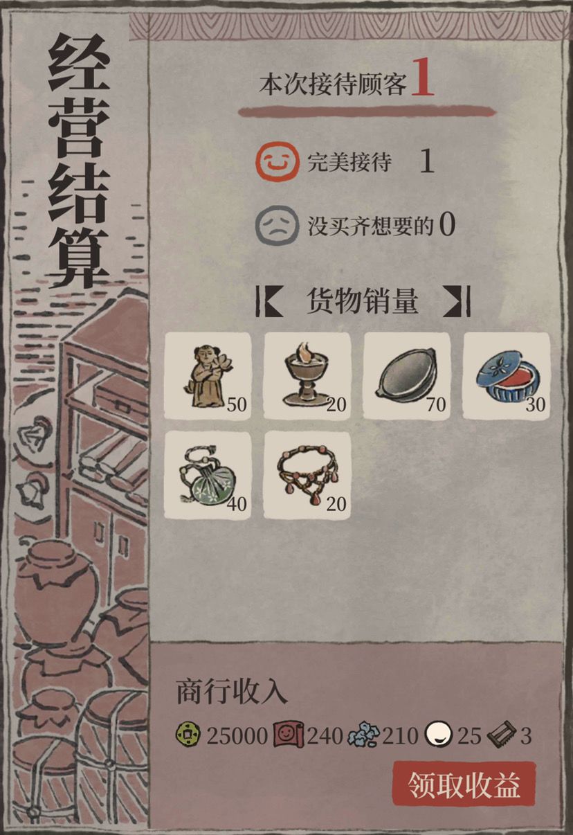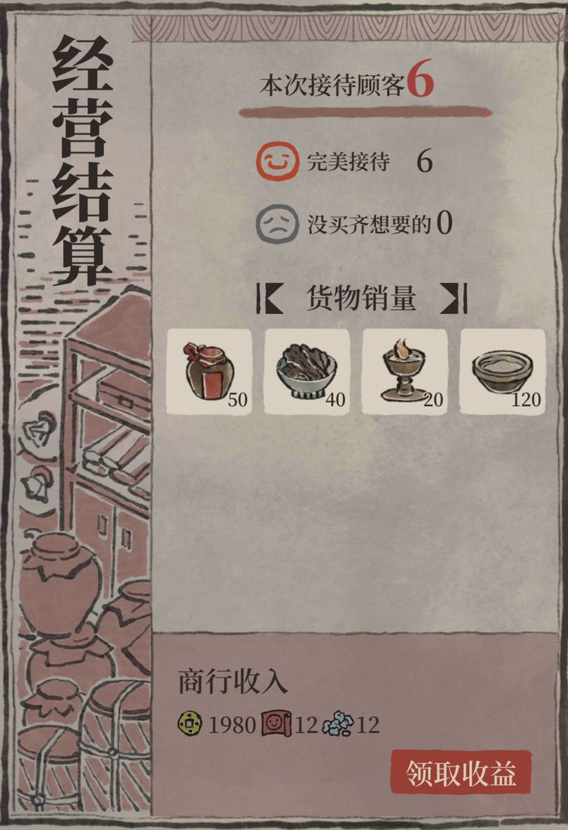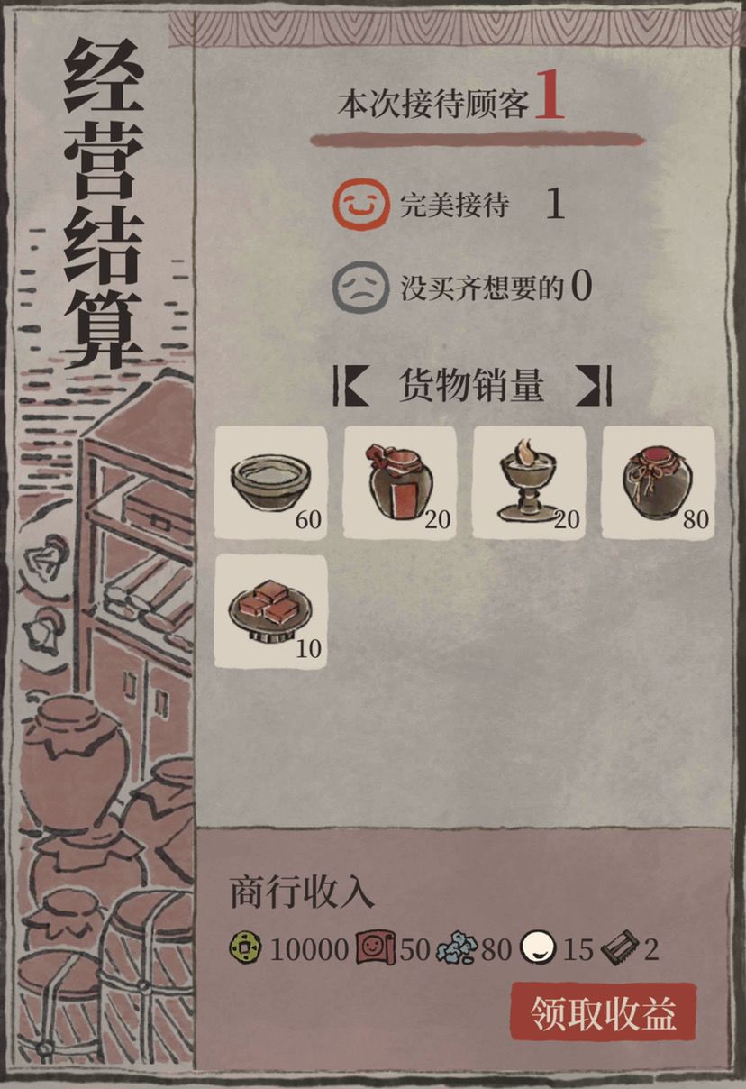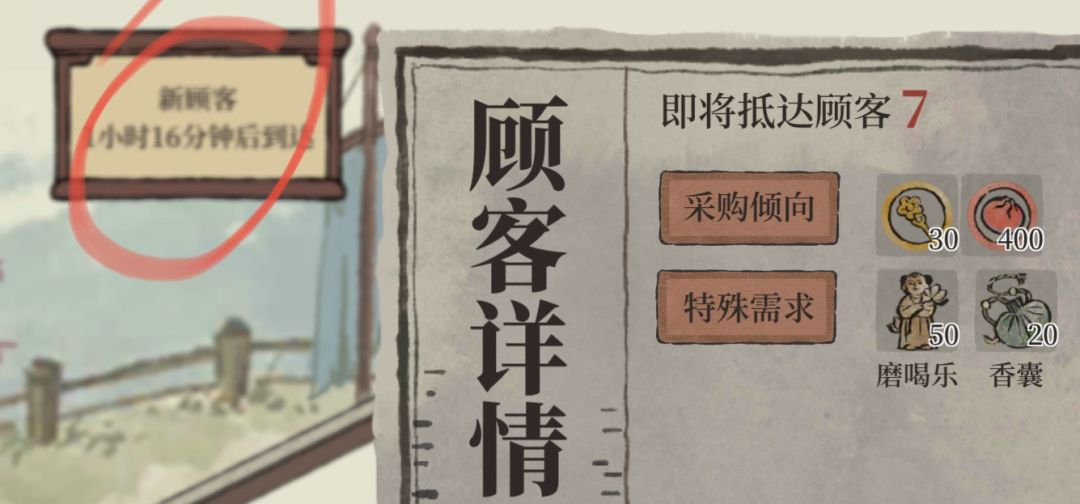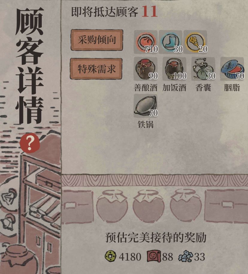 顾客需求:每次顾客访问时间会有倒计时,在商行的左上角可以看到,点击倒计时可以查看这波顾客的具体需求,对于货物匮乏和货架较少的前期来说,可以提前有针对性的生产和摆放货物,提高顾客满意度和收益。注意完美接待和不完美接待的收益差距巨大,特别是对于富商来说,尽量准备充分再点击接客。