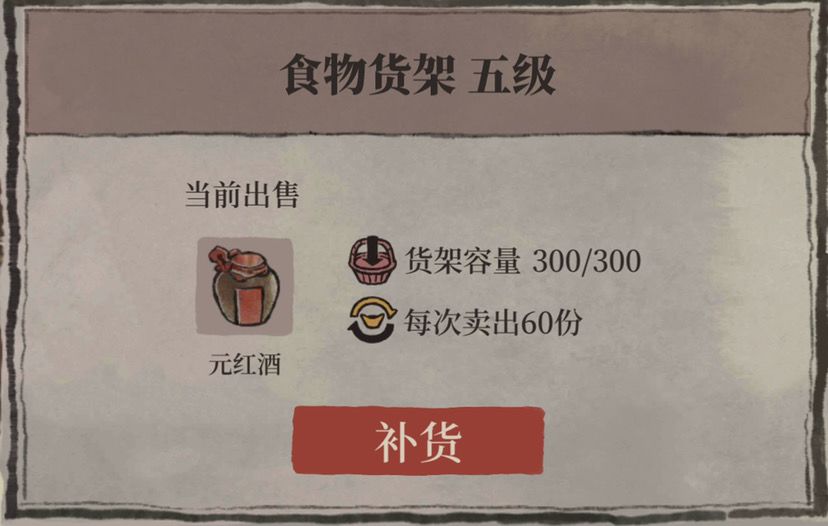 需要注意的是,货架容量并不等同于售货量:1级货架的储量为50,最大售货量为10;2级货架的储量为100,最大售货量为20; 3级货架的储量为150,最大售货量为30; 4级货架的储量为200,最大售货量为40; 5级货架的储量为300,最大售货量为60。