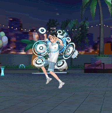 另外,还有一款潮流炫酷的动作饰品也十分值得关注。【鼓动世界】选取数个电子鼓围绕在人物周围,音乐播放时,闪烁的光效结合冰蓝色的灯光,燃爆全场,而人物也随其开始舞动,化身AU世界里的最炫DJ。