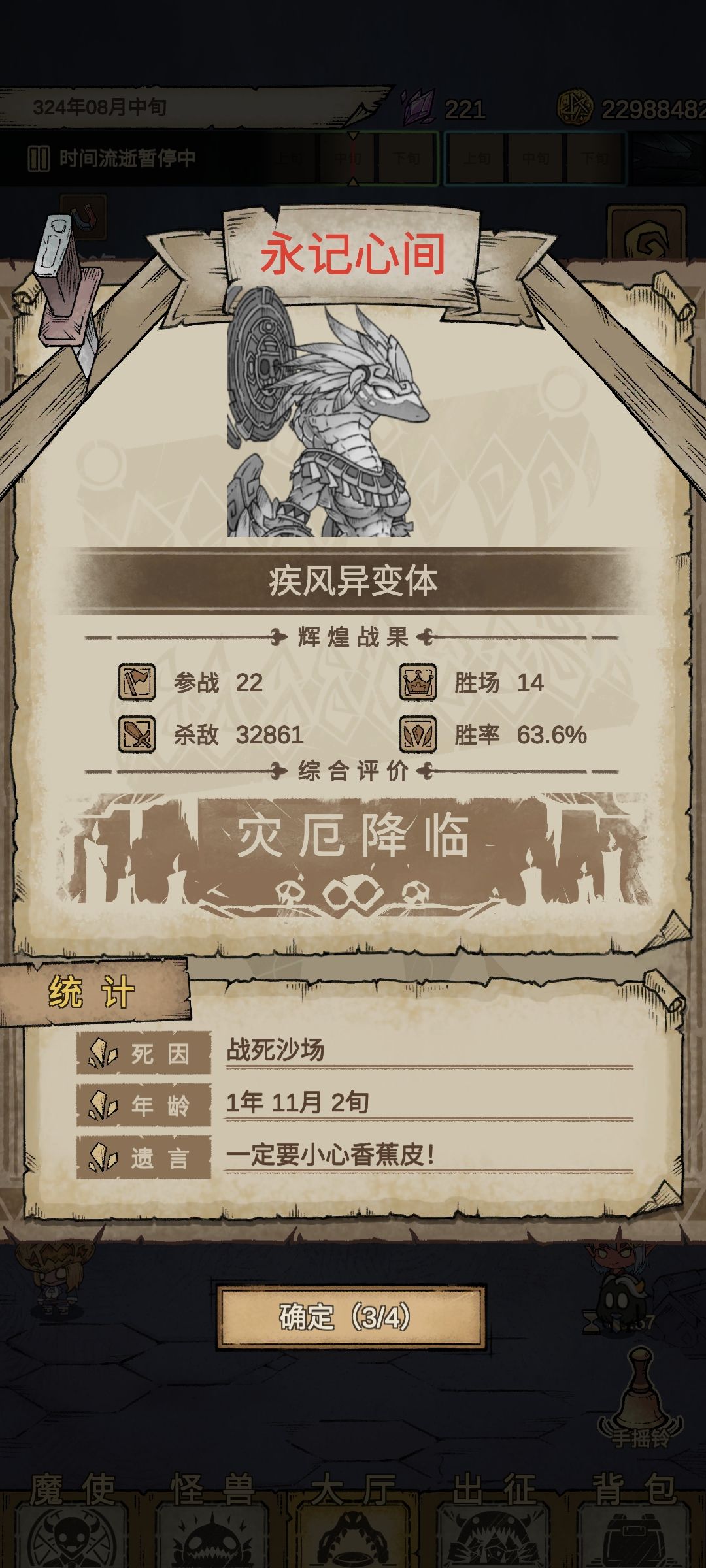 1.这把活了很久,原因之一是这把14关自带了士气激昂, 1,3位的两个菜鸟很快挂了,关卡防御仍然在基础防御阶段(但因为是激昂,所以四号位在17分钟左右挂了)[这里的话,各位可以借鉴一下:士气越低,防御程度越低,蜥蜴人伤害就越低,1/3位可以上垃圾上去卖,评分实在太高,在可以撤退的时候直接把1/3位拉到最左边,它们推了建筑之后无限撤退和取消,它们就会被蜥蜴人打死,留下2/4位置刷钱,所以建议在刷性格经验的时候就多用不契合的种族存点垃圾怪兽,刷钱的时候选到1/3去送]。