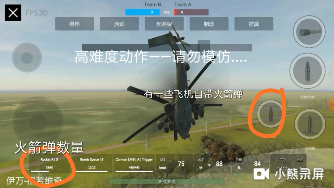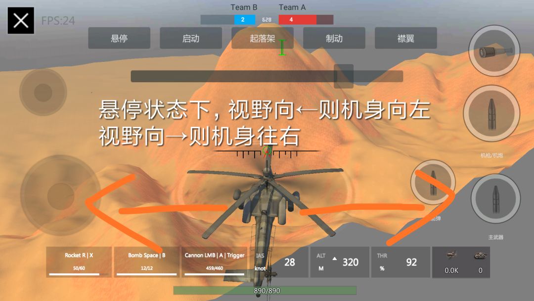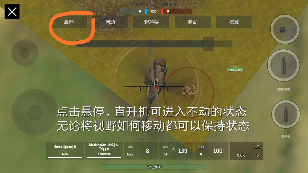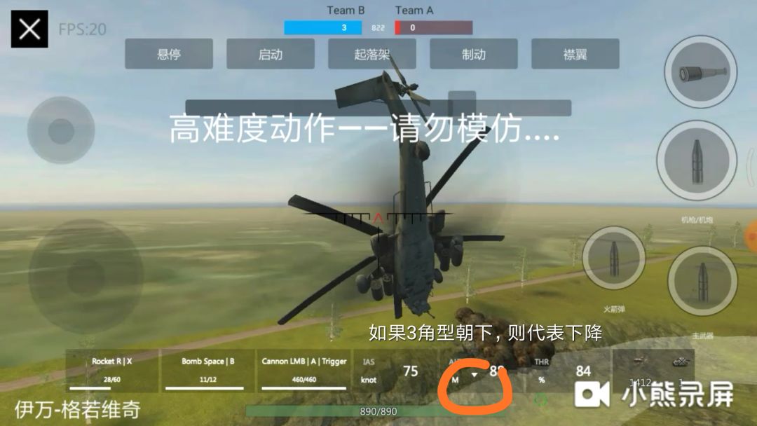 如果第一步你做到了,就可以试试第二步了,点击悬停,你的飞机会进入不动的状态(对ka52无效)这个状态无论你的屏幕怎么动都不会翻滚前移(除非用拉杆)