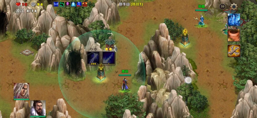 打法:郭嘉站在后面出兵口,贾诩站在前面出兵口,开局在两个英雄身边建造两个天雷塔,留点钱在基地那里在造一个天雷塔防止漏怪,然后在把英雄身边的塔全部升满,最后一波郭嘉直接发技能快速清理点小兵然后去支援贾诩一起打掉boss