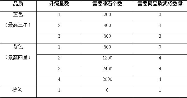 (2)武将只能按品质升星,蓝色最高3星,紫色最高4星,橙色最高5星