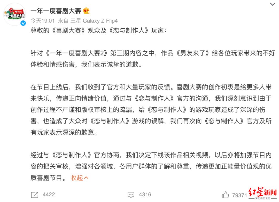 这喜剧作品伤害了游戏玩家?一年一度喜剧大赛道歉10月8日晚间,一年一度喜剧大赛在其官方微博发文,向《喜剧大赛》观众及《恋与制作人》玩家表示:针对《一年一度喜剧大赛2》第三期内容之中,作品《男友来了》给各位玩家带来的不好体验和情感伤害,我们表示诚挚的道歉。