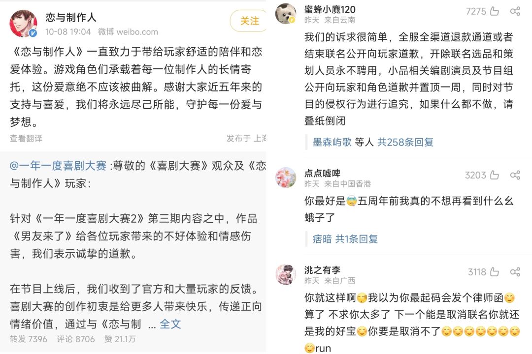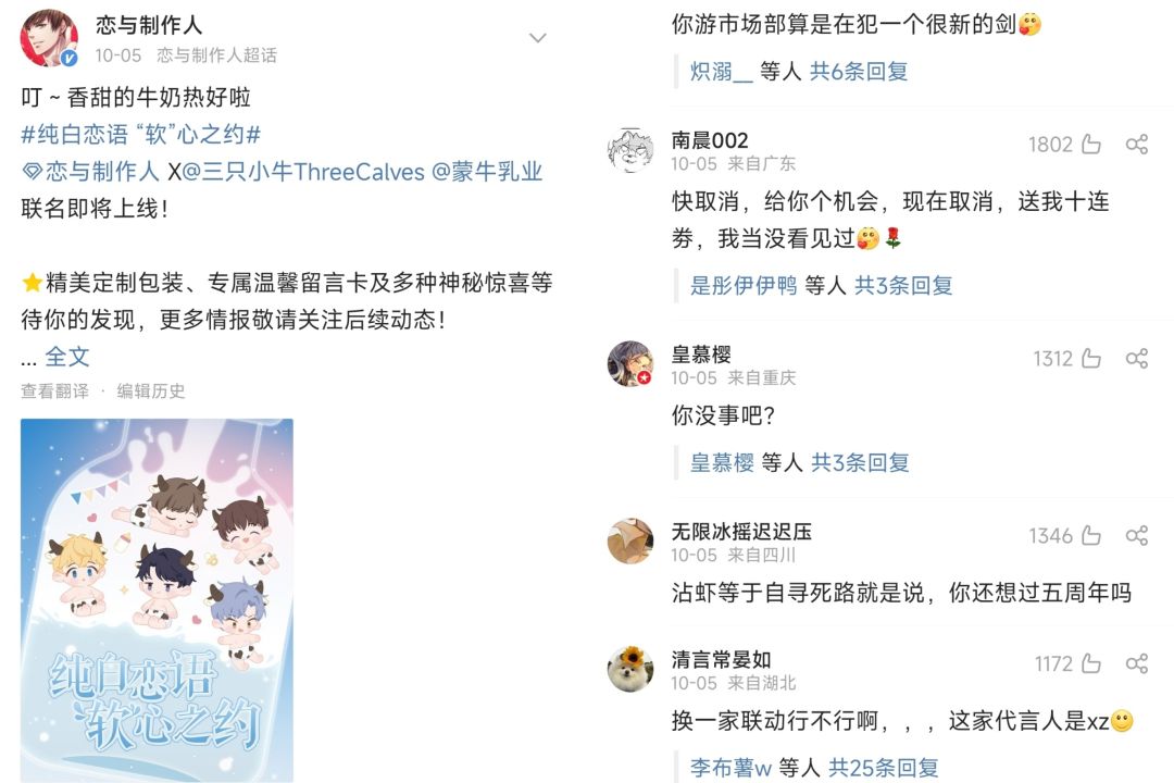 然后最有意思的是,在恋与接受道歉的贴文下,因为和蒙牛联动的事儿,还在被玩家继续炎上中。
