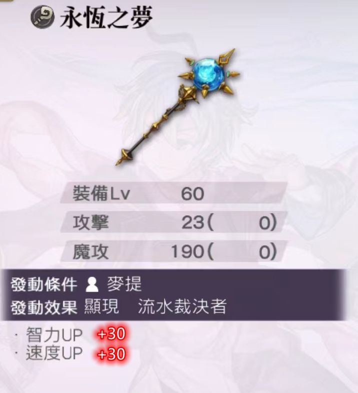 🔹麦提和紫苑一样是最早期的梦见角之一,先前最大的缺点是腿短,真专自带的30速以及技能革新带来了高速提升,也算弥补了这个不足,美中不足的是技能不能自理必爆,在队伍配置的时候摘掉真专武去带亚空的话,相当于舍弃了“30智/速”的加成,非常可惜,更适合配置对应的魔法必爆角色,比如丽瓦雅AS;