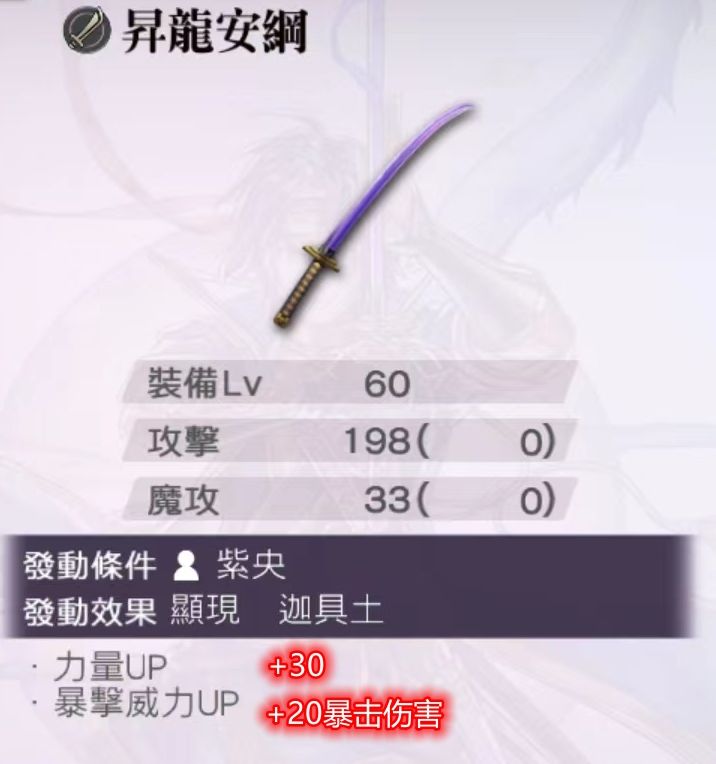 🔹普贤一刀流-神龙:给予单体敌人斩攻击(特大2.6)+力量30%DOWN+物理耐性30DOWN(5回合)+自身力量35%UP(3回合)