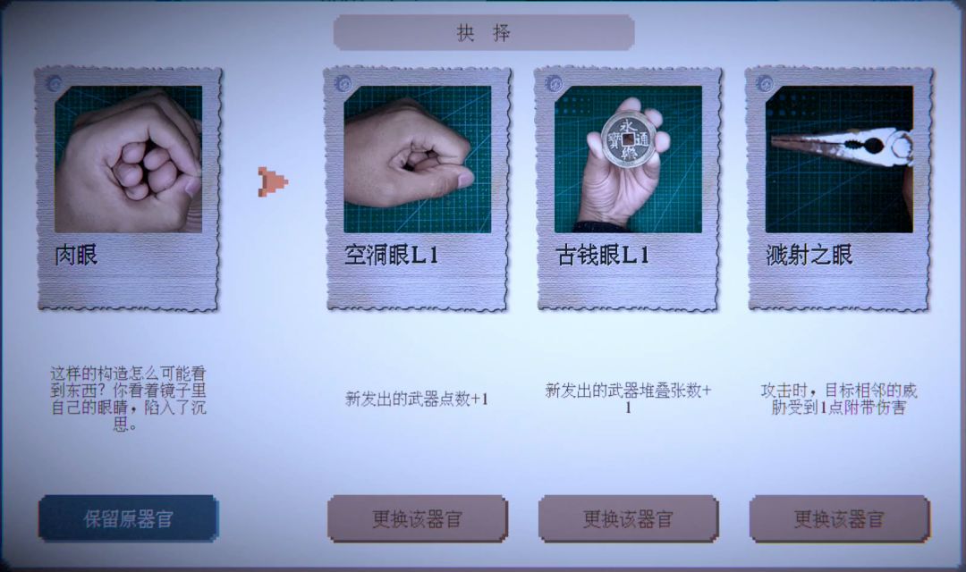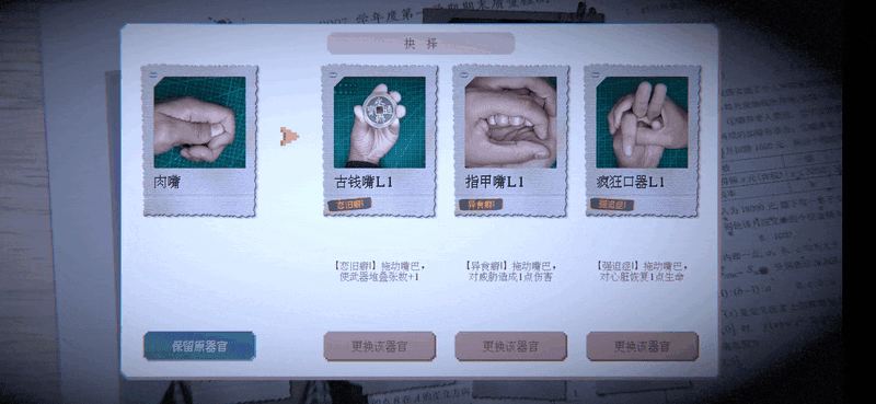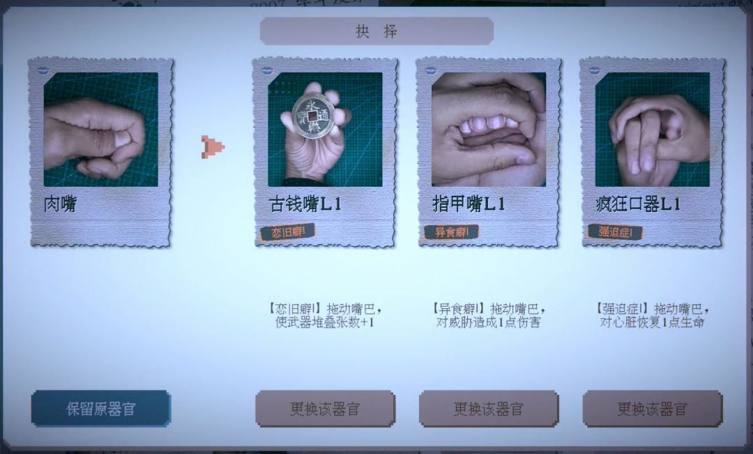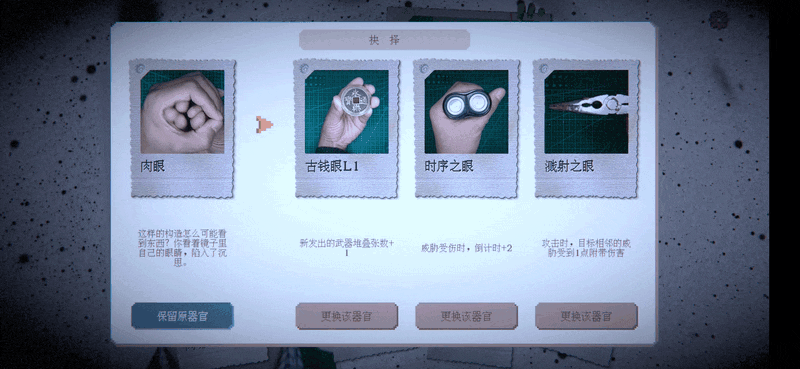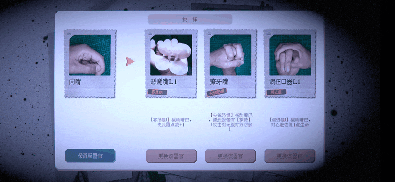 在第二关,游戏的肉鸽要素就出现了,我们的眼睛、鼻子、嘴都是可以替换的: