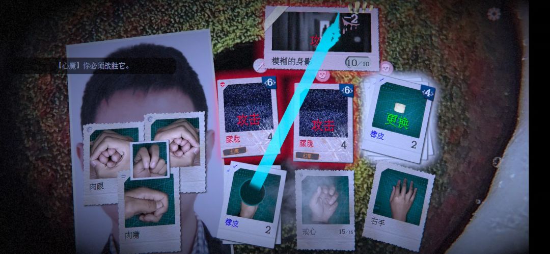 下方的是左右手和心脏,手可以用来抓取中间的卡牌,而心脏下方的数字是你的血量,血量归零游戏就会失败。