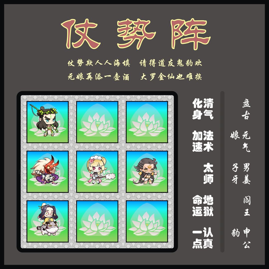 元气娘,此前四法阵已经介绍过了。这里说下和魔礼寿的区别,首选,开局召唤物对鬼王的加成更优一些,木桩灵活性多一些,而貂可能会卡男姜的蛙进而缺失一个单位的加成,元气娘作为法仙可以给申公豹增伤,寿却不能。寿的优势在于,貂有后续战斗力,寿作为医仙可以为盘古提供一些续航保障。