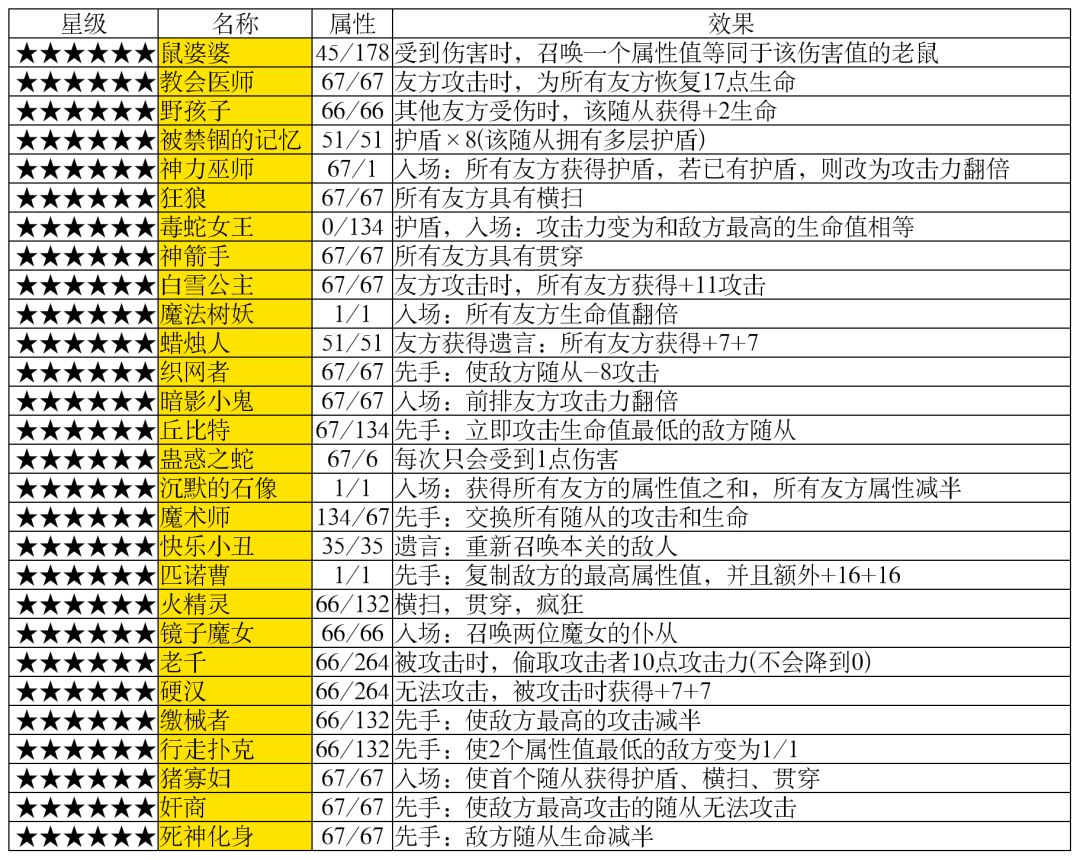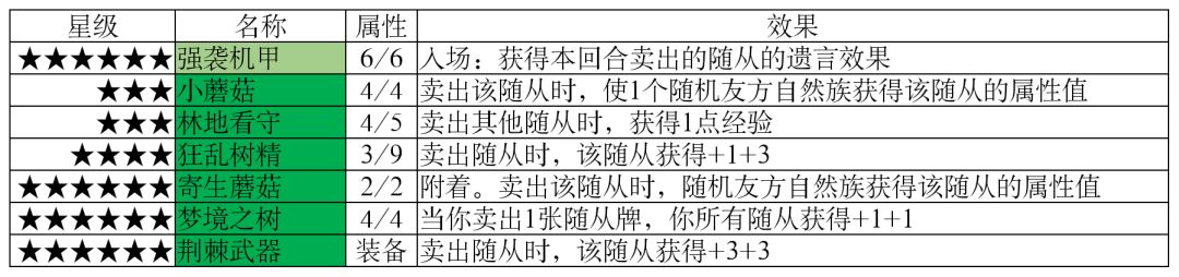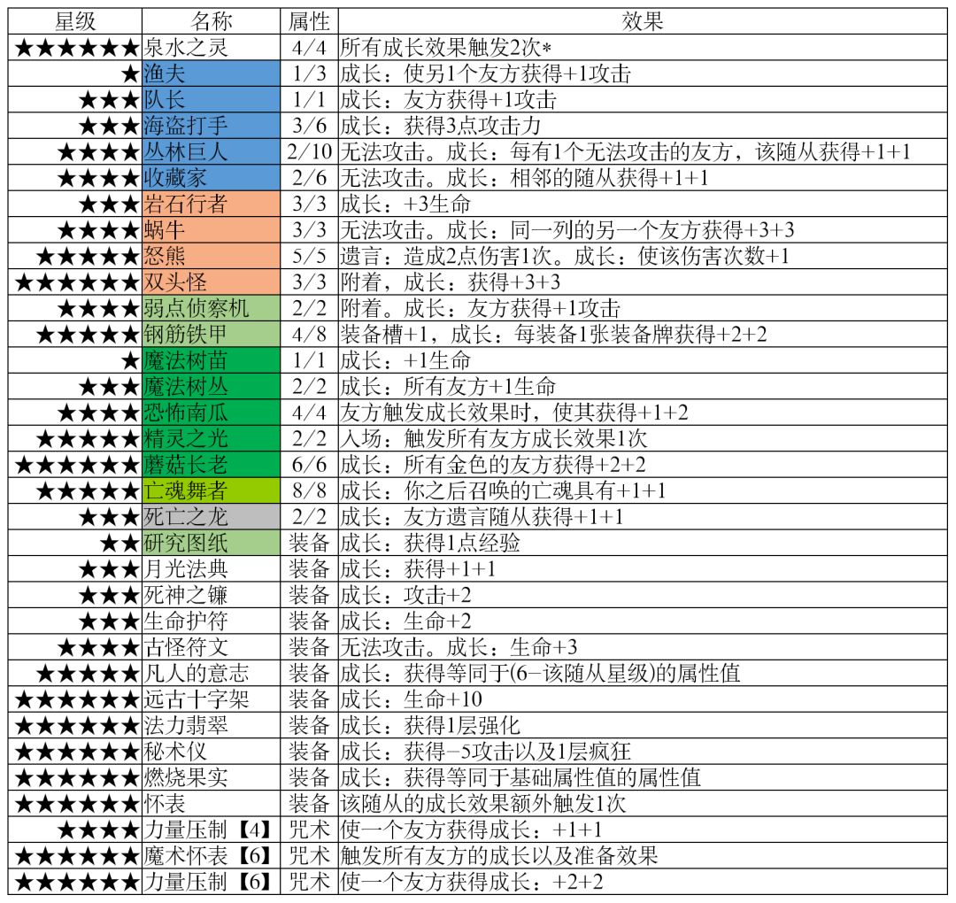 【入场】作为一次性效果,少量增加属性值的入场随从性价比相当低,不如能持续生效的成长随从,剔去这部分后得到如下随从