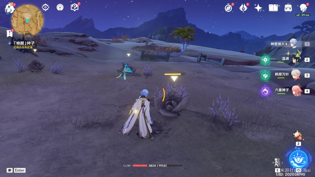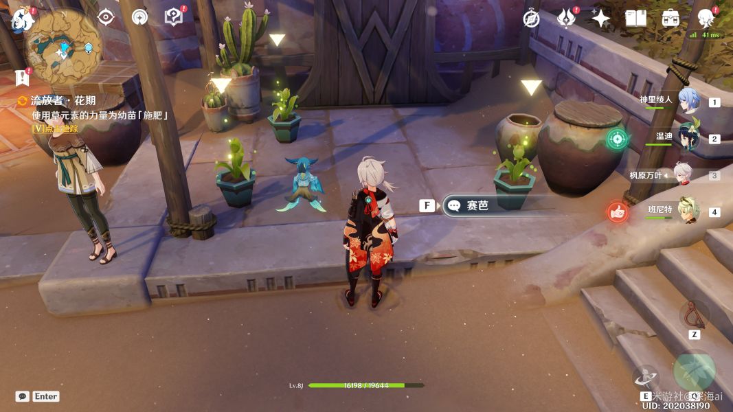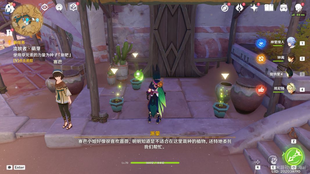 第二天:流浪者·花期如果赛芭头上没有任务图标就先对话一次~仍然是使用草元素角色攻击三个幼苗来施肥即可